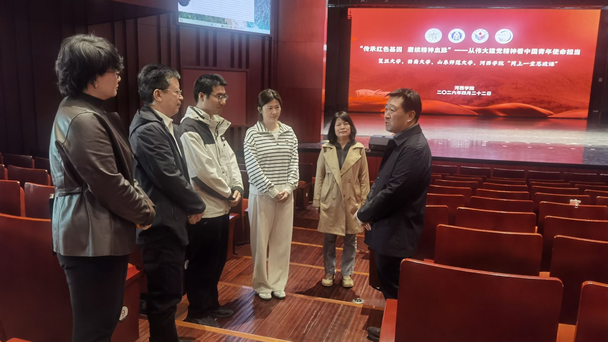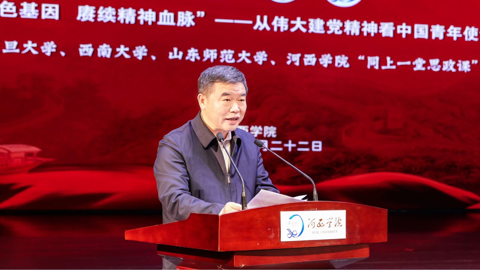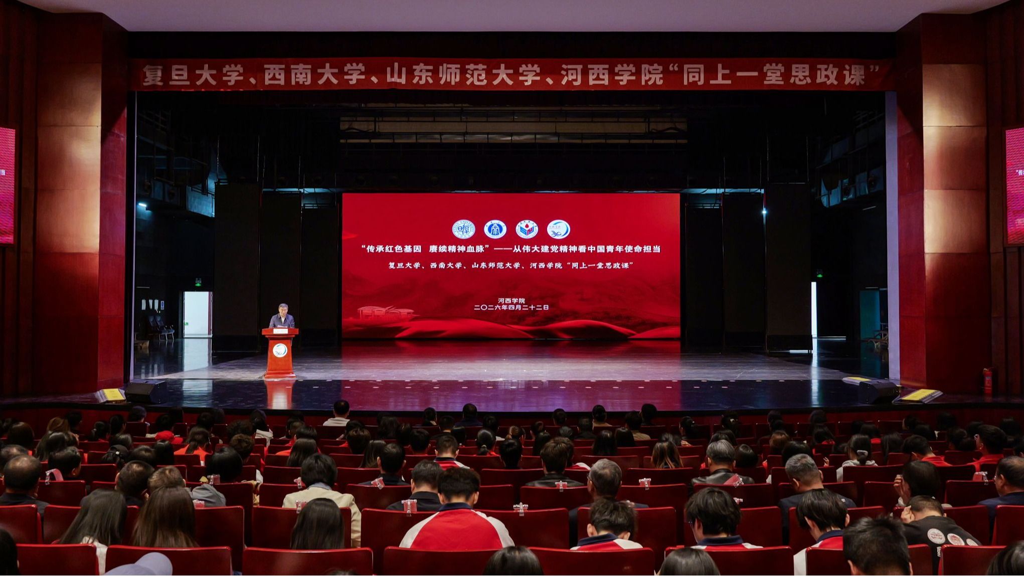 为学习贯彻习近平总书记关于思政课建设的重要指示批示精神,全面提高学校思政课教学质量,推进“大思政课”建设。4月22日,河西学院联合复旦大学、西南大学、山东师范大学,以“传承红色基因 赓续精神血脉——从伟大建党精神看中国青年使命担当”为主题,开展四校“同上一堂思政课”。学校党委书记王向阳,校长李广,党委副书记高荣,党委常委、宣传部部长褚建霞,相关部门负责人,二级学院党委书记、辅导员,全体思政课教师及学生代表900余人参加。