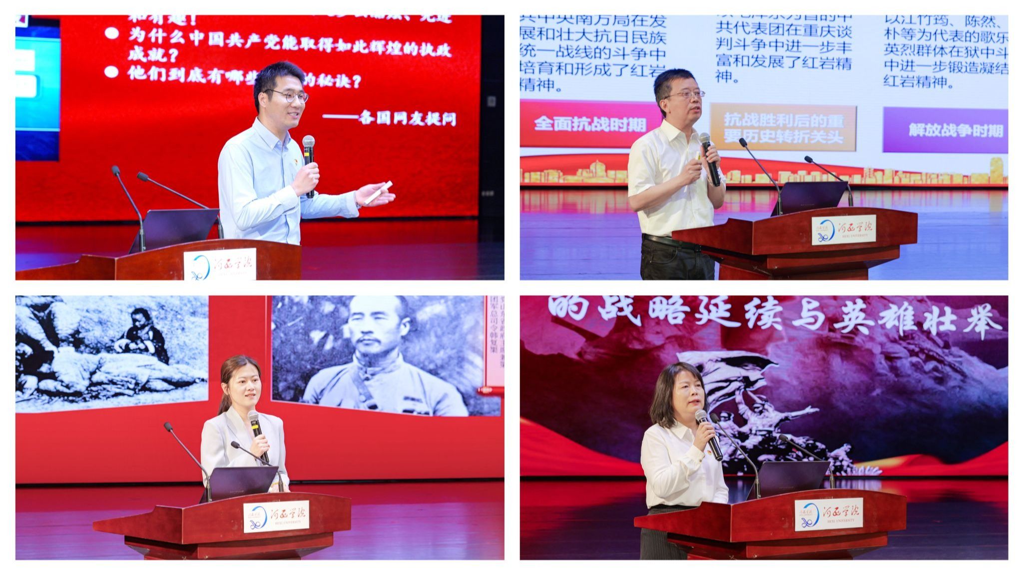 课程以“伟大建党精神”为根脉,四校主讲教师依次展开阐释:复旦大学马克思主义学院杨宁老师从建党历程与早期共产党人的生动事迹,阐释伟大建党精神的孕育形成、生动展现与时代传承,剖析伟大建党精神作为红色精神谱系“根脉”的深刻内涵;西南大学马克思主义学院宋明老师聚焦“红岩精神”,讲述重庆雾霭中“背黑暗向光明”的忠诚与斗志;山东师范大学马克思主义学院张伟丽老师结合沂蒙精神的“党群同心、军民情深、水乳交融、生死与共”,诠释“江山就是人民,人民就是江山”的初心真谛;河西学院马克思主义学院张正琴老师以伟大长征精神为序,解读西路军“生命不息、战斗不止”的精神密码。课程尾声,师生共同观看央视微视频《百年风华》,四位教师与学生代表共同朗诵李大钊《青春》节选片段,课程在“以青春之我,创建青春之家庭、国家、民族”的青春共鸣中升华为新时代青年的铮铮誓言。