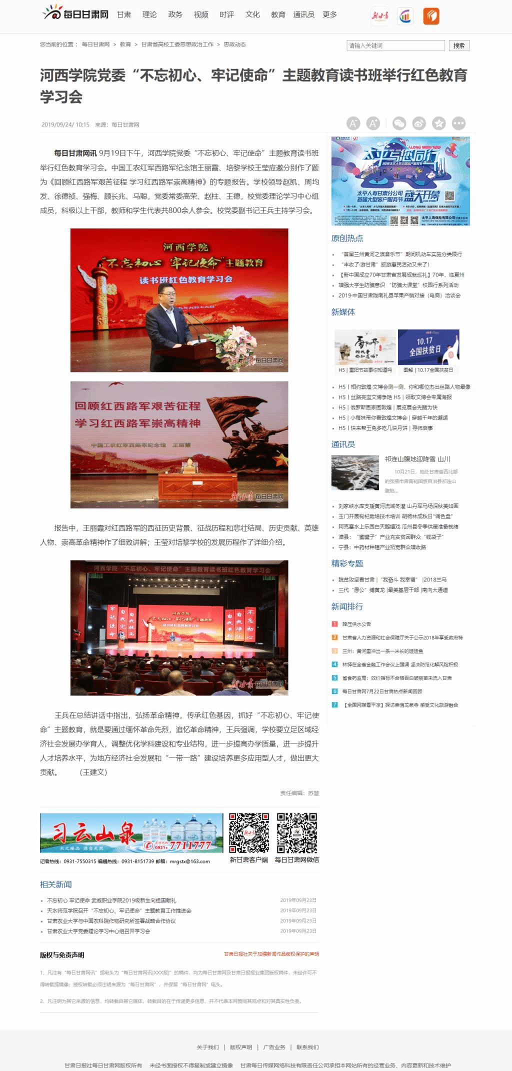 每日甘肃网讯 9月19日下午,河西学院党委“不忘初心、牢记使命”主题教育读书班举行红色教育学习会。中国工农红军西路军纪念馆王丽霞、培黎学校王莹应邀分别作了题为《回顾红西路军艰苦征程 学习红西路军崇高精神》的专题报告。学校领导赵凯、周均发、徐德祯、强梅、顾长兆、马聪,党委常委高荣、赵柱、王德,校党委理论学习中心组成员,科级以上干部,教师和学生代表共800余人参会。校党委副书记王兵主持学习会。