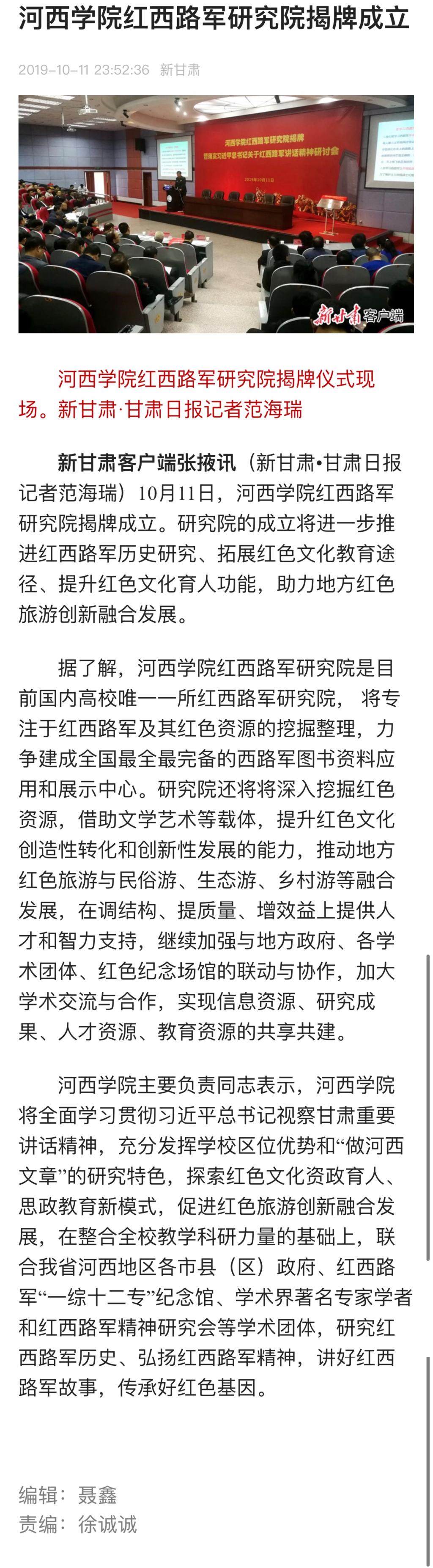 新甘肃客户端张掖讯(新甘肃•甘肃日报记者范海瑞)10月11日,河西学院红西路军研究院揭牌成立。研究院的成立将进一步推进红西路军历史研究、拓展红色文化教育途径、提升红色文化育人功能,助力地方红色旅游创新融合发展。