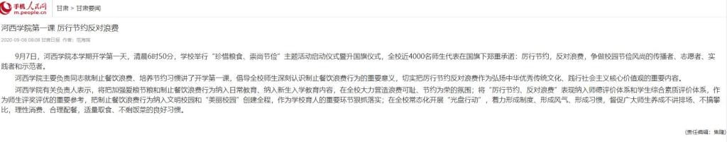 河西学院主要负责同志就制止餐饮浪费、培养节约习惯讲了开学第一课,倡导全校师生深刻认识制止餐饮浪费行为的重要意义,切实把厉行节约反对浪费作为弘扬中华优秀传统文化、践行社会主义核心价值观的重要内容。
