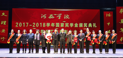 12月25日上午,河西学院2017-2018学年国家奖学金颁奖典礼暨学生工作表彰大会在河西讲堂举行。学校领导黎志强、张汉燚、王兵、周均发、张勇、徐德祯、顾长兆,党委常委赵柱、王德以及二级学院、相关职能部门领导,学生家长代表,辅导员、班主任和学生代表共计900余人参加了会议。大会由党委常委、副校长强梅主持。
