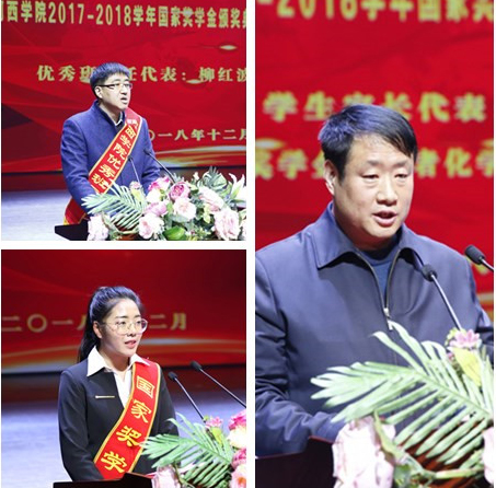 学生家长代表国家奖学金获得者郭俊杉父亲郭守诚发言,感谢国家、学校、各位老师为学生成长成才所做的一切。希望学生们努力学习,为以后步入社会打下坚实的基础。作为家长,将积极推进“家校合作”,为学生们的成才一起努力。部分未到典礼现场的获奖学生家长发来了视频,表达对国家、学校的感激之情,同时祝愿每一位学生都能梦想成真。