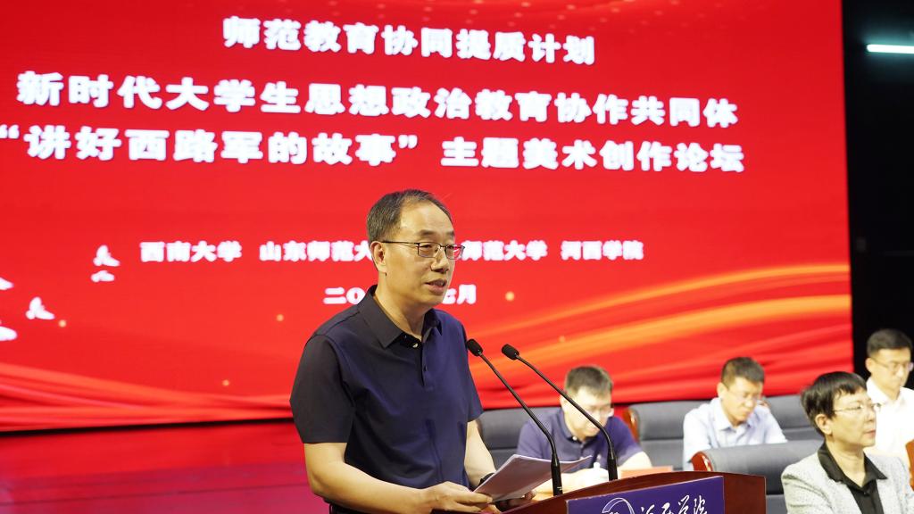 7月11日上午,西南大学、山东师范大学、西北师范大学、河西学院联合举办师范教育协同提质计划“新时代大学生思想政治教育协作共同体”“讲好西路军的故事”主题美术创作论坛暨西北师大与河西学院战略合作协议签约仪式。山东师范大学党委书记冯继康,西南大学副校长赵玉芳,山东师范大学党委常委、副校长张茂聪,西北师范大学副校长张明军,学校党委书记梁兆光等领导、专家出席仪式并致辞。校党委副书记、校长周勇主持仪式。