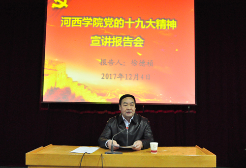 按照学校党的十九大精神宣讲工作具体安排,12月4日下午,学校宣讲团成员、党委常委、纪委书记徐德祯为机关各支部、后勤管理处党总支、离退休工作处党总支、图书馆党总支、历史文化与旅游学院、马克思主义学院、法学院、化学化工学院、经济管理学院、教师教育学院、文学院、音乐学院、体育学院、美术学院等部门单位干部师生作了党的十九大精神宣讲报告。