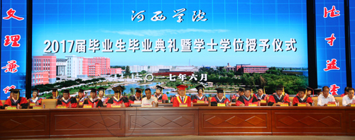 典礼上,宣读了河西学院2017届毕业生名单和河西学院2017届授予学士学位毕业生名单;表彰了2017届优秀大学毕业生和2017年学生考研组织工作先进单位。学校领导为奔赴新疆、西藏就业,考取研究生、国家公务员,省委选调、自主创业、在校期间为学校获得荣誉的2017届优秀大学毕业生代表颁发了证书;校长、学位委员会主任刘仁义教授为获得学士学位的毕业生代表一一正冠拨苏。