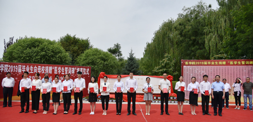 揭幕仪式上,党委书记黎志强与毕业生代表共同为“医学生誓词碑”揭幕,并挂戴校友之花;校长张汉燚向毕业生代表颁发了捐赠誓词碑纪念牌,并接受校友名册;副校长张勇、徐德祯、强梅为校友联络员颁发聘书。医学院党委书记宣读了校友联络员聘任的决定,医学院负责人对2019届全体毕业生表示衷心祝贺,希望同学们要珍惜这个时代,担负时代使命,在担当中历练,在尽责中成长,让青春在新时代改革开放的广阔天地中绽放,让人生在实现中国梦的奋进追逐中展现出勇敢奔跑的英姿,努力成为德、智、体、美、劳全面发展的社会主义建设者和接班人。2019届毕业生代表回顾了大学几年里与母校共同成长的美好记忆,表达了对母校和老师培养和教育的感恩之情;为母校捐赠的医学生誓词碑寄托了2019届全体毕业生对母校的无限留恋与祝福。