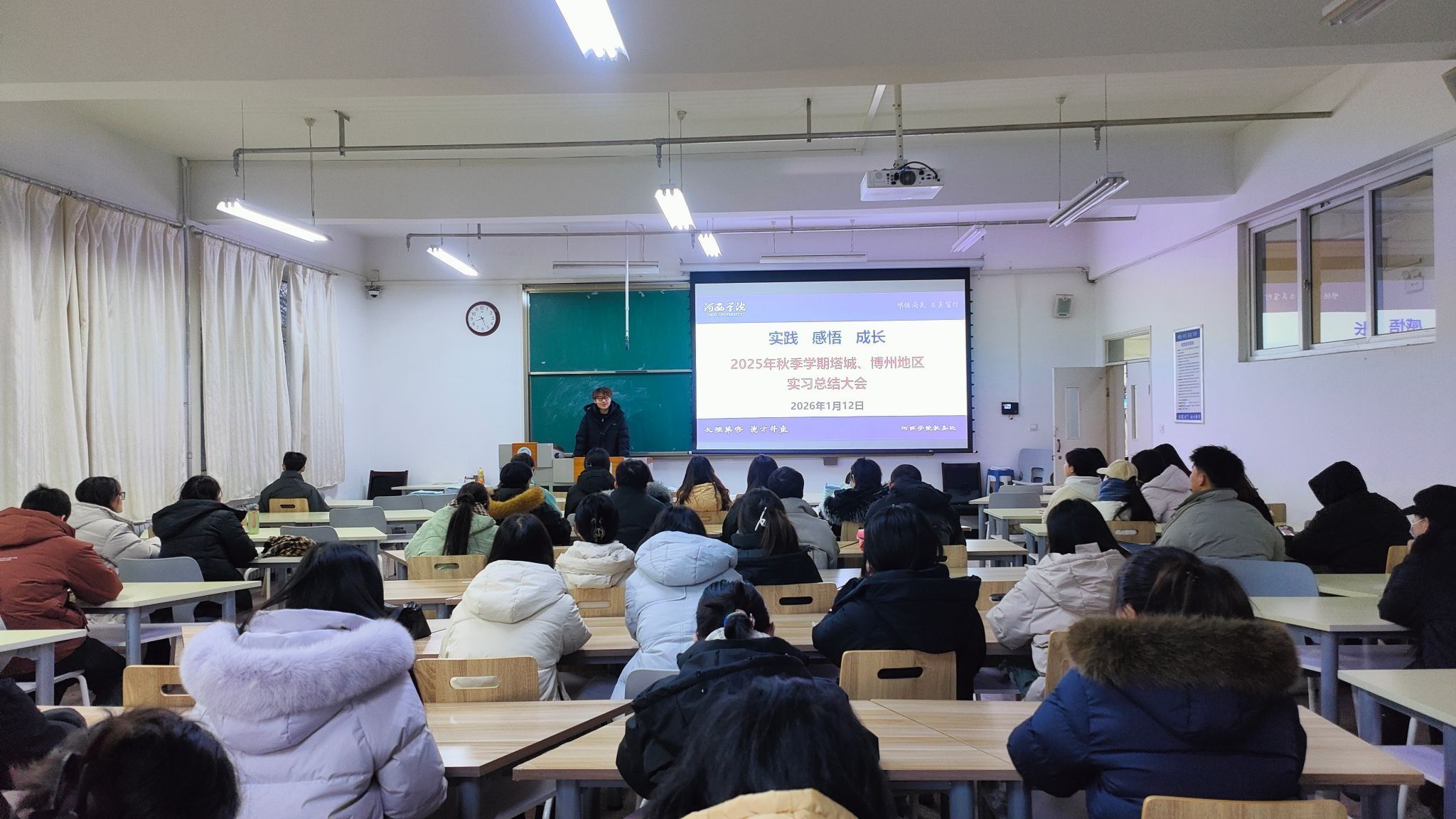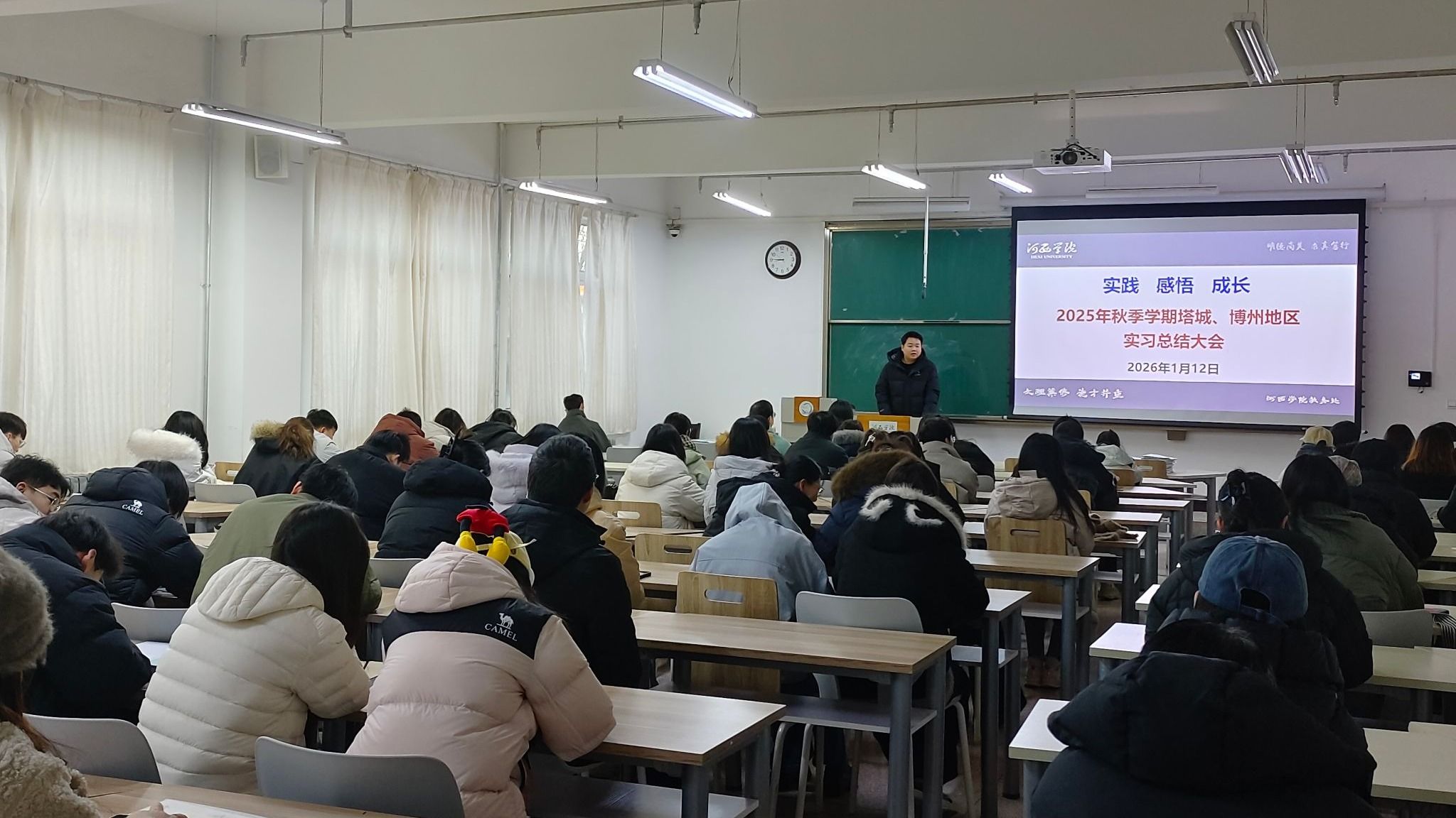 总结会上,同学们分享了在新疆支教期间从初登讲台的忐忑到从容授课的成长历程,讲述与当地学生的深厚情谊,汇报参与校园文化建设、辅导课外活动的创新实践,并交流对边疆教育发展的观察与思考。发言中同学们感情真挚,尽显对新疆教育事业的热爱和对当地教师和孩子的眷恋,同学们纷纷表示,希望毕业后重返新疆、扎根新疆,与万千河西学子一道建设新疆、奉献新疆。