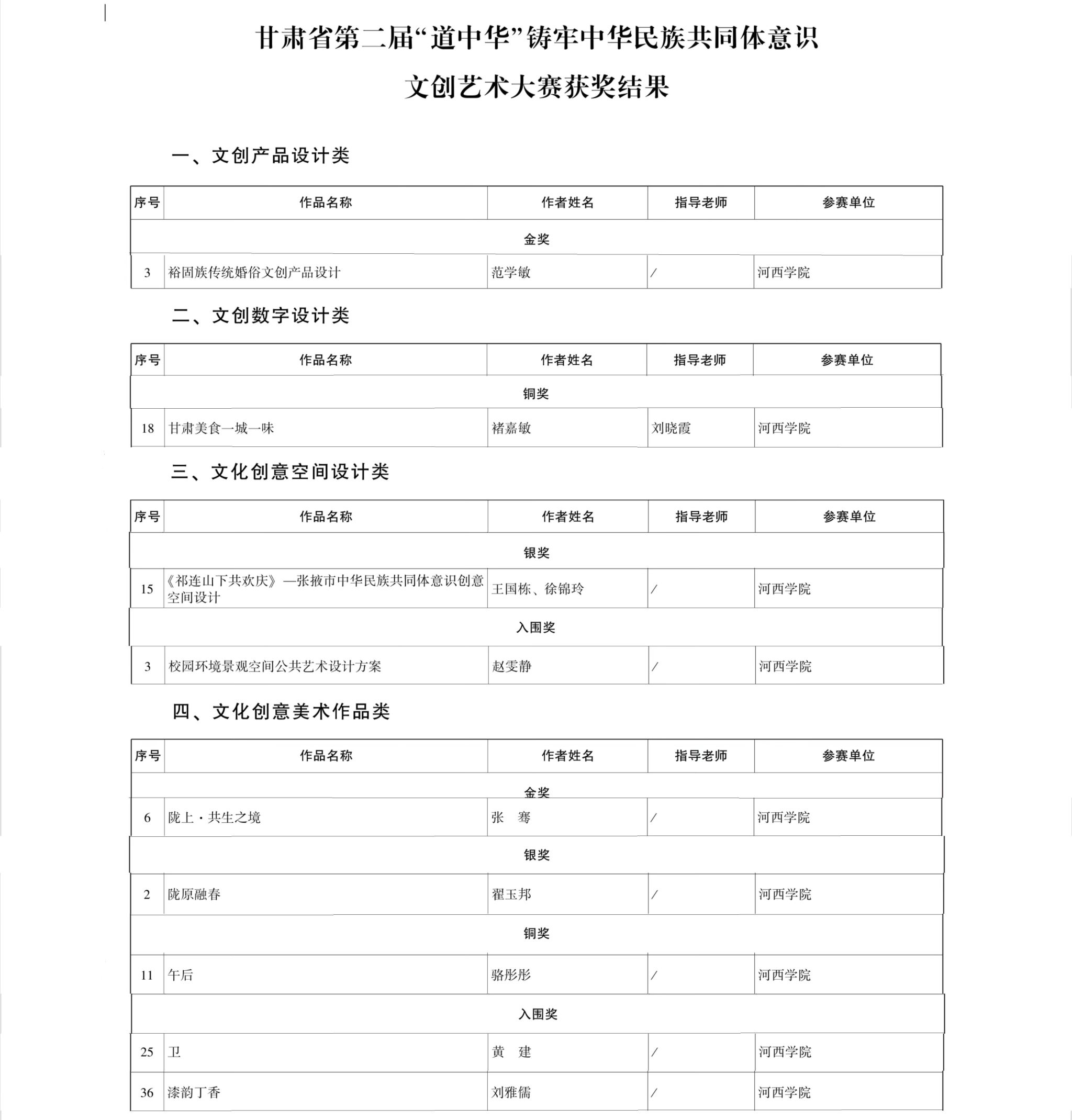 近日,由中共甘肃省委统战部指导,省民族事务委员会、省教育厅、省文化和旅游厅、西北民族大学联合主办的甘肃省第二届“道中华”铸牢中华民族共同体意识文创艺术大赛获奖结果公布,学校有9件作品获奖,其中金奖2件、银奖2件、铜奖2件、入围奖3件;学校获优秀组织奖。