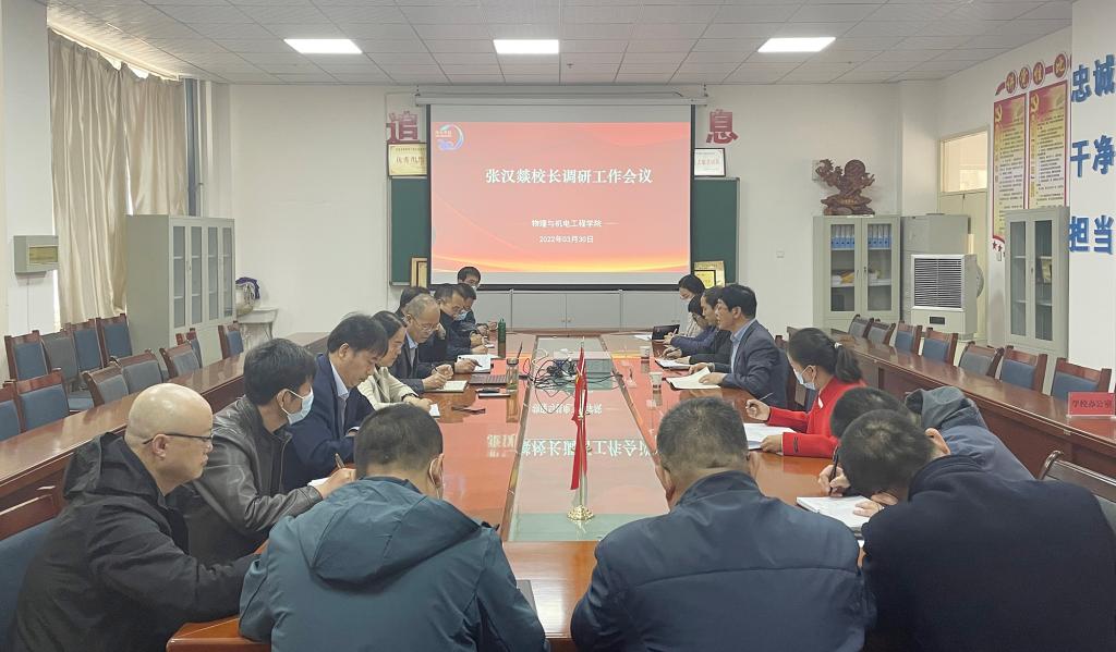 3月30日下午,校长张汉燚带领学科建设与研究生处、教务处、科技处等部门负责人到物理与机电工程学院调研。物理与机电工程学院领导班子、教研室、办公室、教师代表参加了会议。