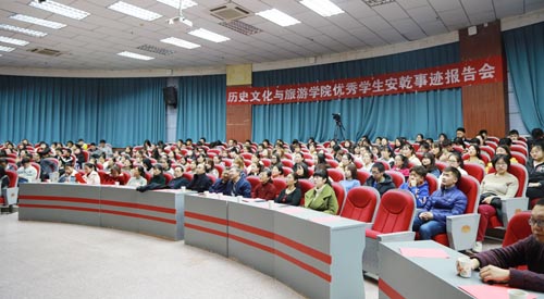 3月7日,历史文化与旅游学院在图书馆学术厅举办国家奖学金获得者安乾同学先进事迹报告会。党委常委、组织部长高荣,学生处负责人及历史文化与旅游学院师生300多人参加了会议。
