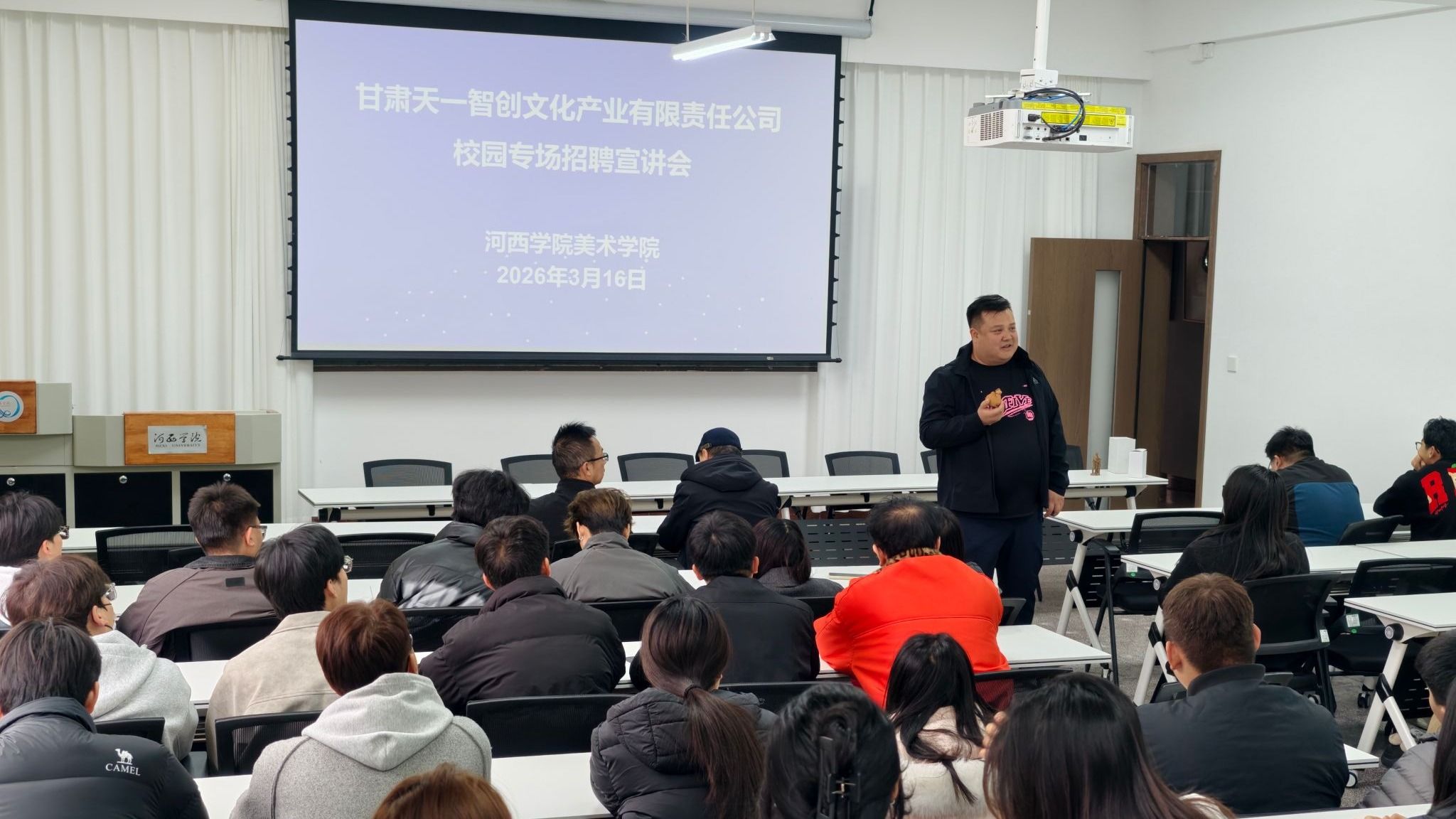 甘肃天一智创文化产业有限责任公司聚焦文创产品研发、3D数字打印、文化IP开发等核心业务,是省内以“3D打印技术+丝路文化”打造全链条文创产业的创新型企业。公司负责人围绕企业发展、业务布局、人才需求与职业发展、工作内容、薪酬福利、晋升通道及本地人才支持政策等方面作详细宣讲。同时现场展示企业文创作品与3D打印成果,耐心解答同学们关于职业发展、项目实践、实习转正等问题。
