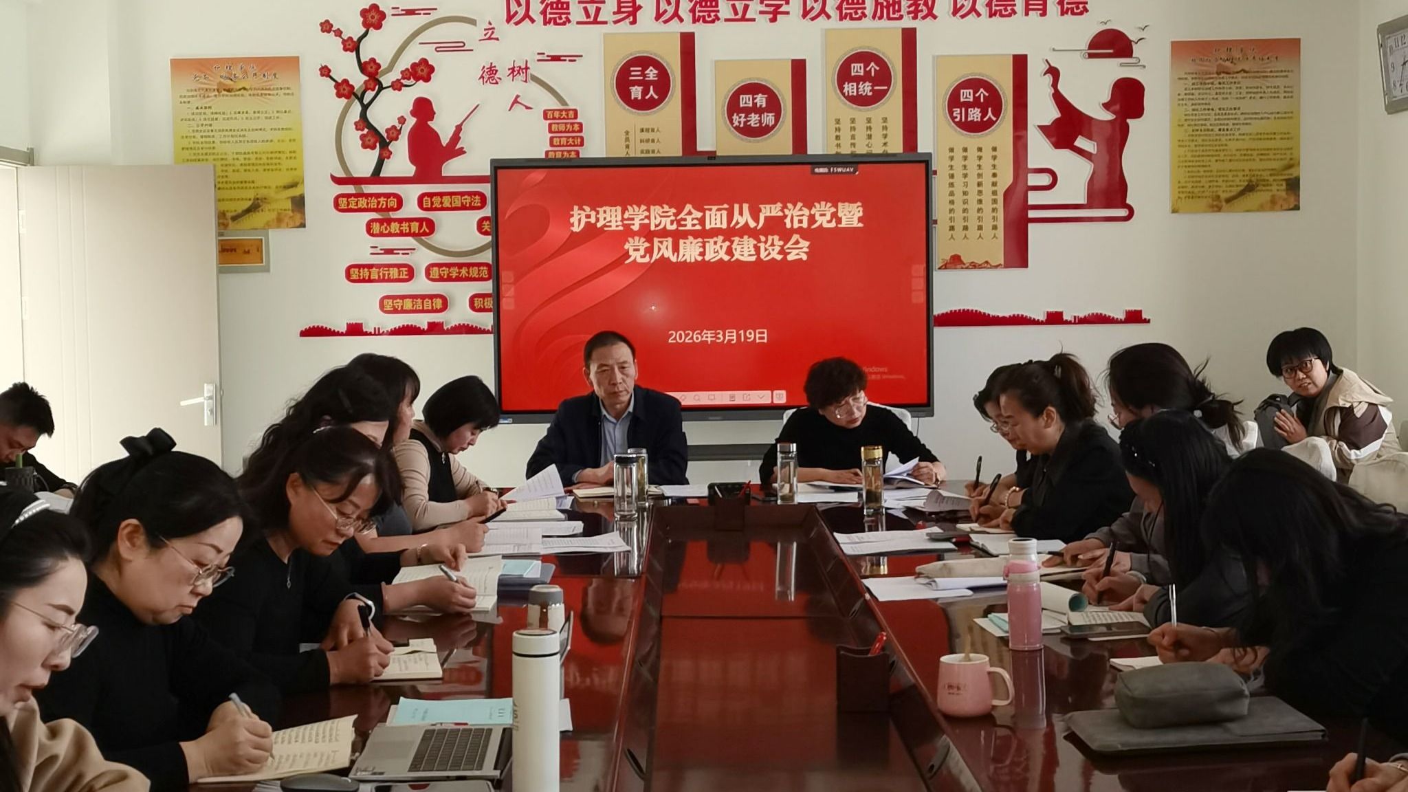 3月19日,护理学院召开全面从严治党暨党风廉政建设会,党委负责人主持,学院全体教师参加。