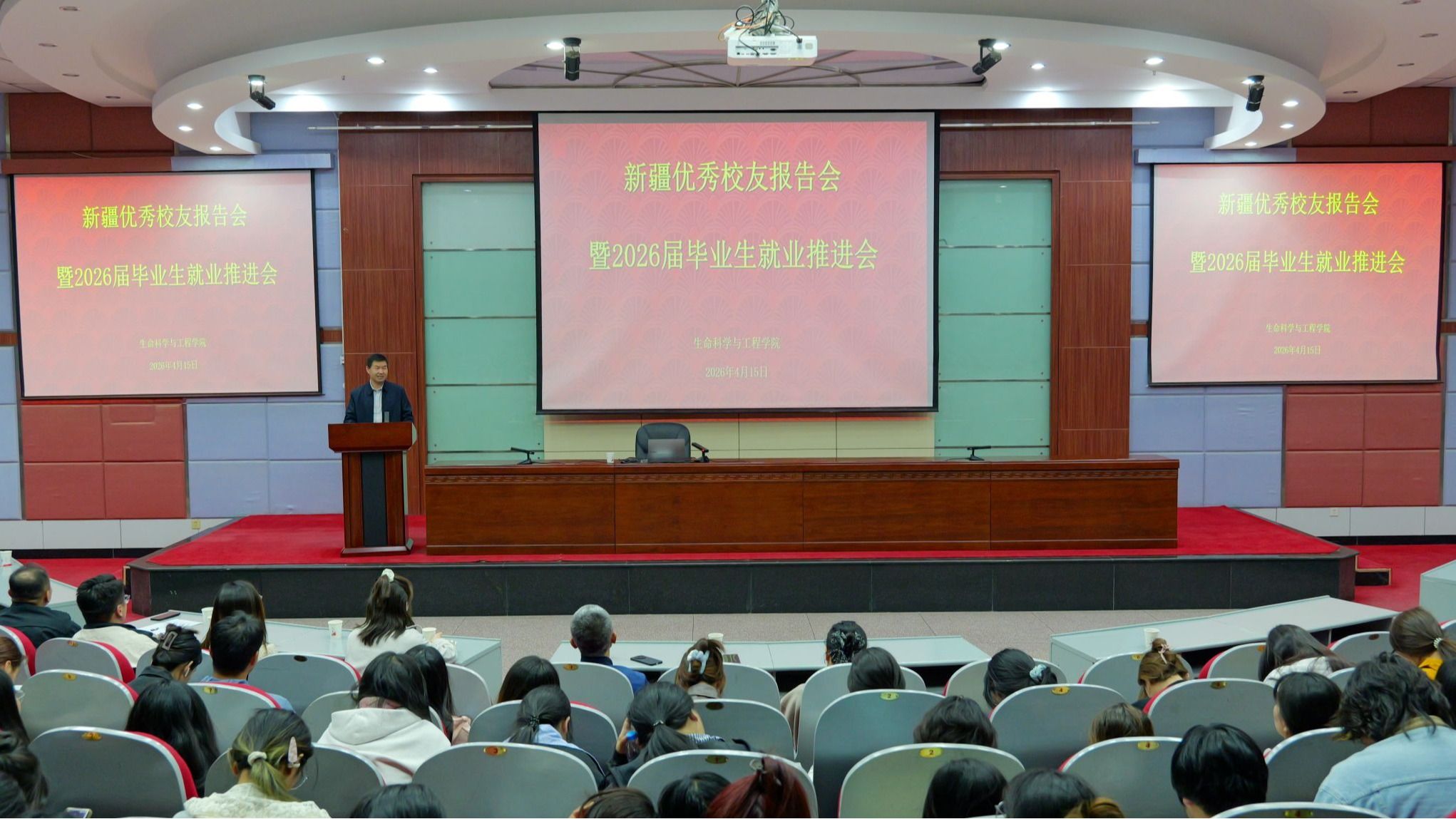 4月15日,生命科学与工程学院举办新疆优秀校友报告会暨2026届毕业生就业推进会。学院负责人、毕业班班主任及2026届未就业毕业生、2023级学生代表共200余人参加。