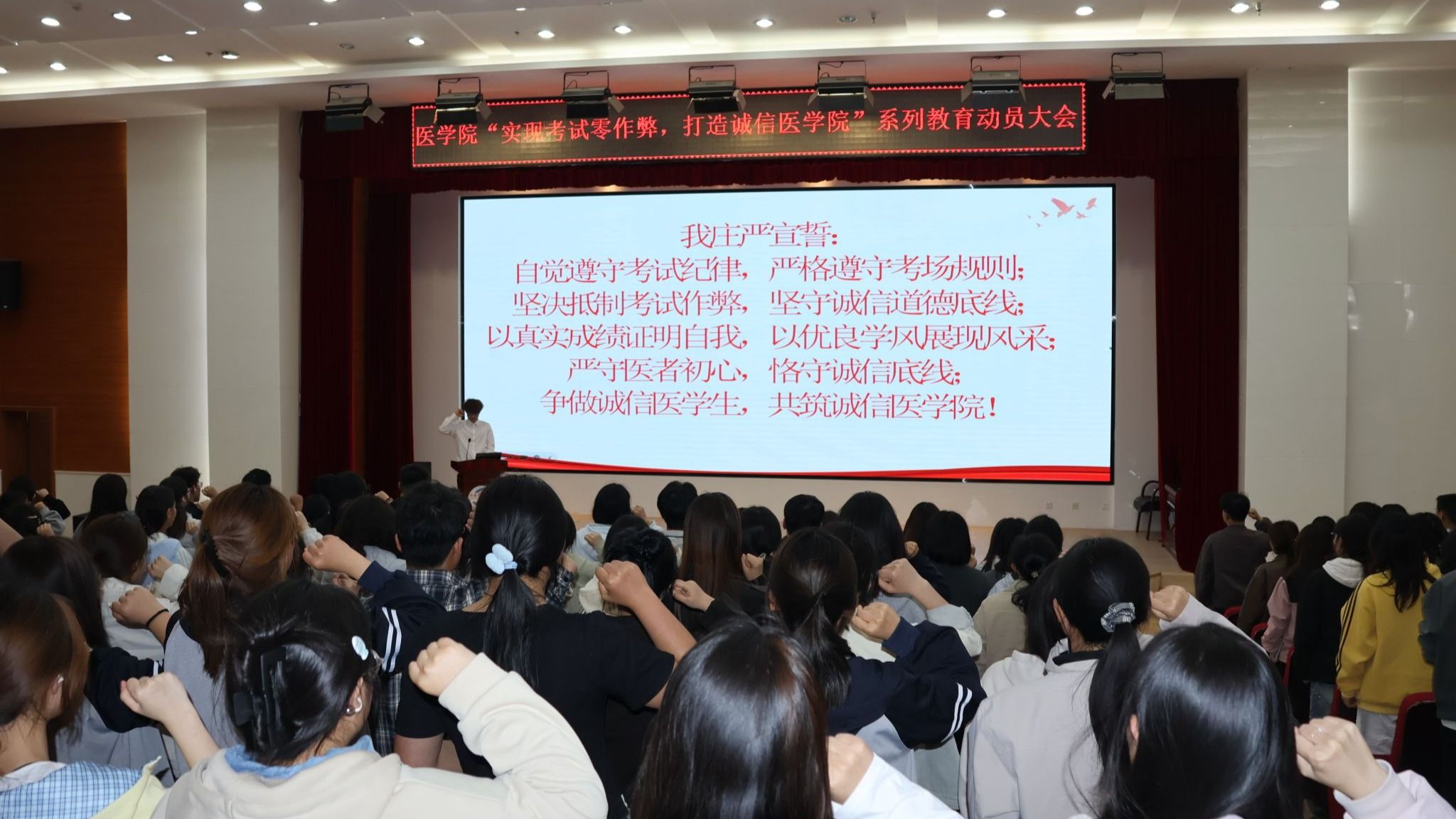 4月20日,医学院召开“实现考试零作弊,打造诚信医学院”系列教育动员会。学院负责人,教科办、学工办负责人,班主任代表、全体辅导员及各班班长、团支书、学习委员等270 余名学生骨干参加。