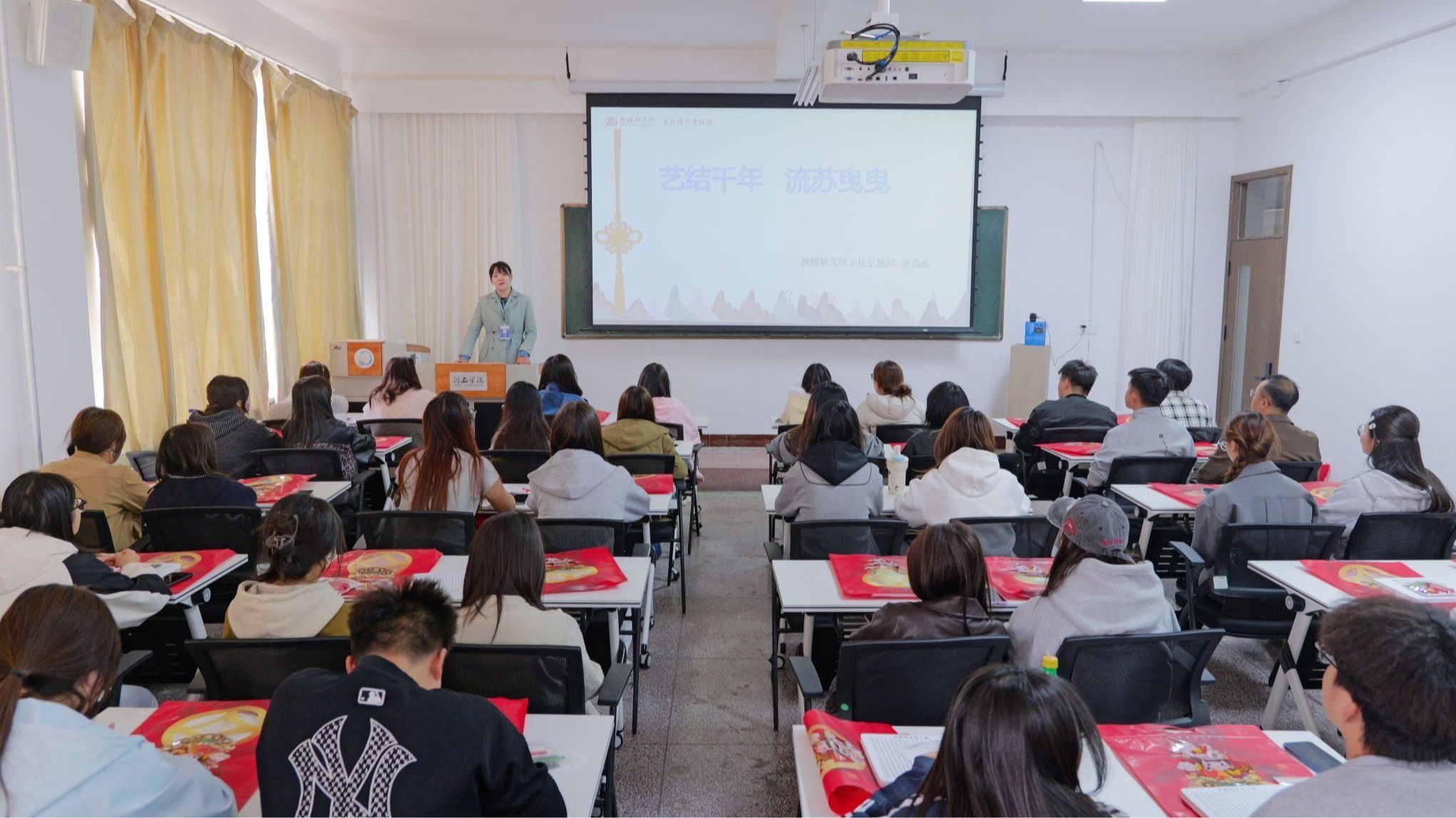 本次活动形式丰富,在“共绘敦煌・守护千年”集体长卷创作中,学生以飞天等敦煌经典元素完成大型主题长卷。“韵结敦方”非遗中国结编织体验课上,同学们学习基础绳结技法,感受非遗魅力。专题讲座中,研究院老师系统讲解莫高窟历史与文化遗产保护。次日,“凝固的繁花”沥粉堆金体验课开课,指导老师讲解技法,学生分组实操完成敦煌特色工艺作品,体验传统美术工艺价值。