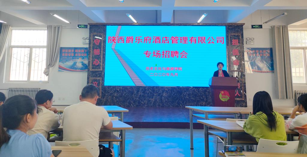 9月16日上午,历史文化与旅游学院与陕西爵乐府酒店管理有限公司在就业招聘大厅联合举办2021届毕业生首场专场招聘会。历史文化与旅游学院党总支负责人、陕西爵乐府酒店管理有限公司人事总监及历史文化与旅游学院2021届毕业生共200余人参加现场招聘,2020届毕业生通过直播参加招聘。
