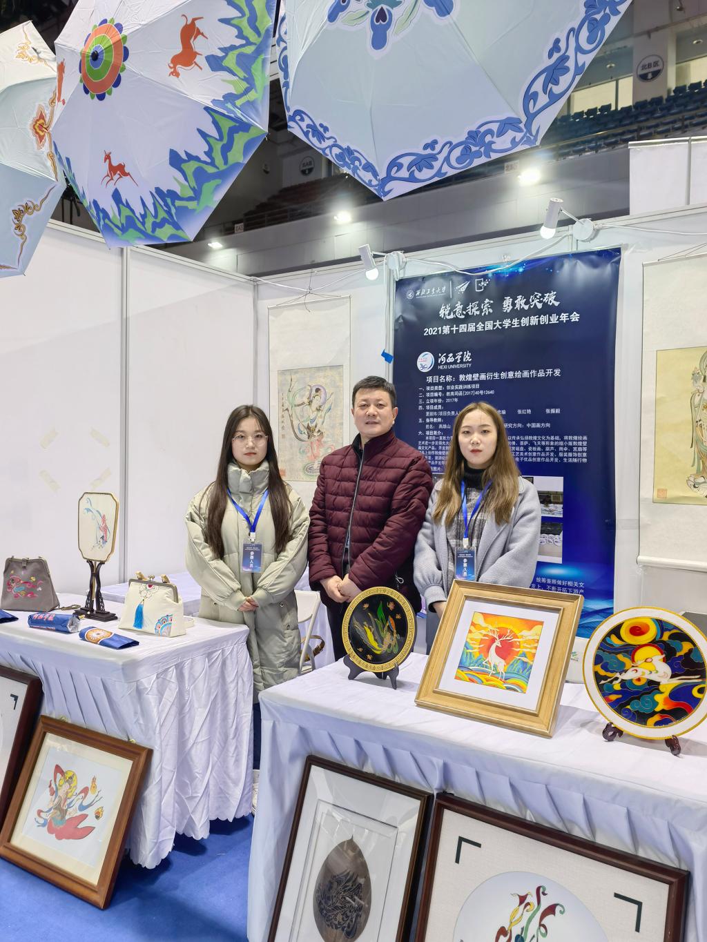 12月10日至12号日,由教育部主办,西北工业大学承办的第十届全国大学生创新创业年会在西北工业大学长安校区举行。我校高雄山老师指导的敦煌壁画衍生创意绘画作品被作为推荐项目在年会上展示交流,在专门展位展出了我校大学生创新创业项目开发的缩小版壁画绘制作品、雨伞、扇面、背包、观赏盘等。