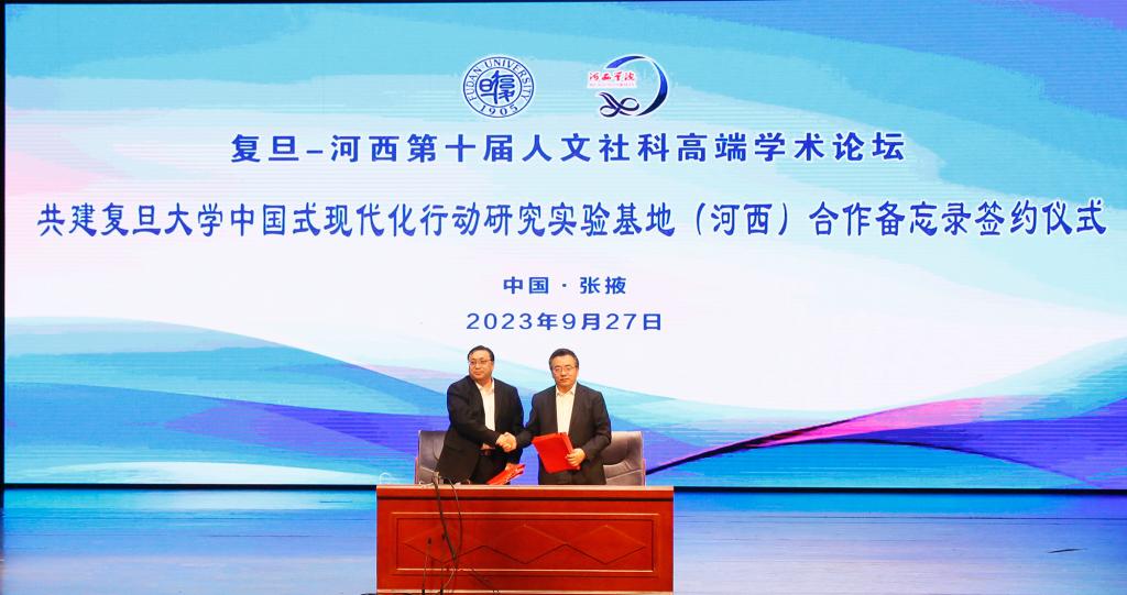 9月27日,复旦-河西第十届人文社科高端学术论坛在我校开幕。会上,两校代表共同签署《共建复旦大学中国式现代化行动研究实验基地(河西)合作备忘录》,就设立“复旦大学中国式现代化行动研究实验基地(河西)”事项进行达成备忘,进一步深化两校在文科科研领域对口支援合作。