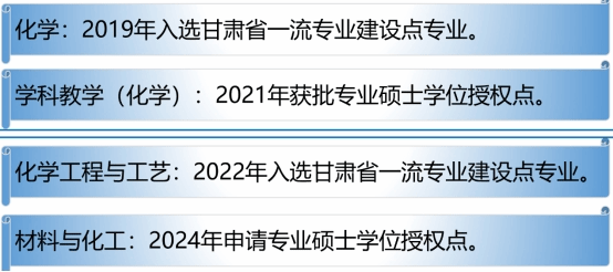 学院高度重视学科专业和课程建设,深入把握学科发展规律、产业需求规律、人才培养规律,凝练学科专业建设方向,优化学科专业结构,以培养德智体美劳全面发展、实践创新能力强的高素质应用型人才为目标,潜心育人育才。化学专业为甘肃省一流专业建设点专业和甘肃省高校特色专业,2021年获批学科教学(化学)硕士学位授权点,为其他专业的建设起到了示范作用。化学工程与工艺专业2022年获批甘肃省一流专业建设点专业。依托应用化学、化学工程与工艺两个专业,2023年,申报材料与化工专业硕士授权点。《化学教学论》4门课程为省级精品课程,《物理化学》为省级网络资源共享课,《分析化学》5门课程为甘肃省一流课程,《化学综合实验》为甘肃省创新创业示范课程。近五年,获甘肃省教学成果二等奖2项、一等奖1项,甘肃省教学成果培养项目6项,甘肃省创新创业教育教学改革研究项目2项,河西学院教学成果一等奖5项、二等奖6项,学院学科专业发展势头良好,教学科研成果突出。