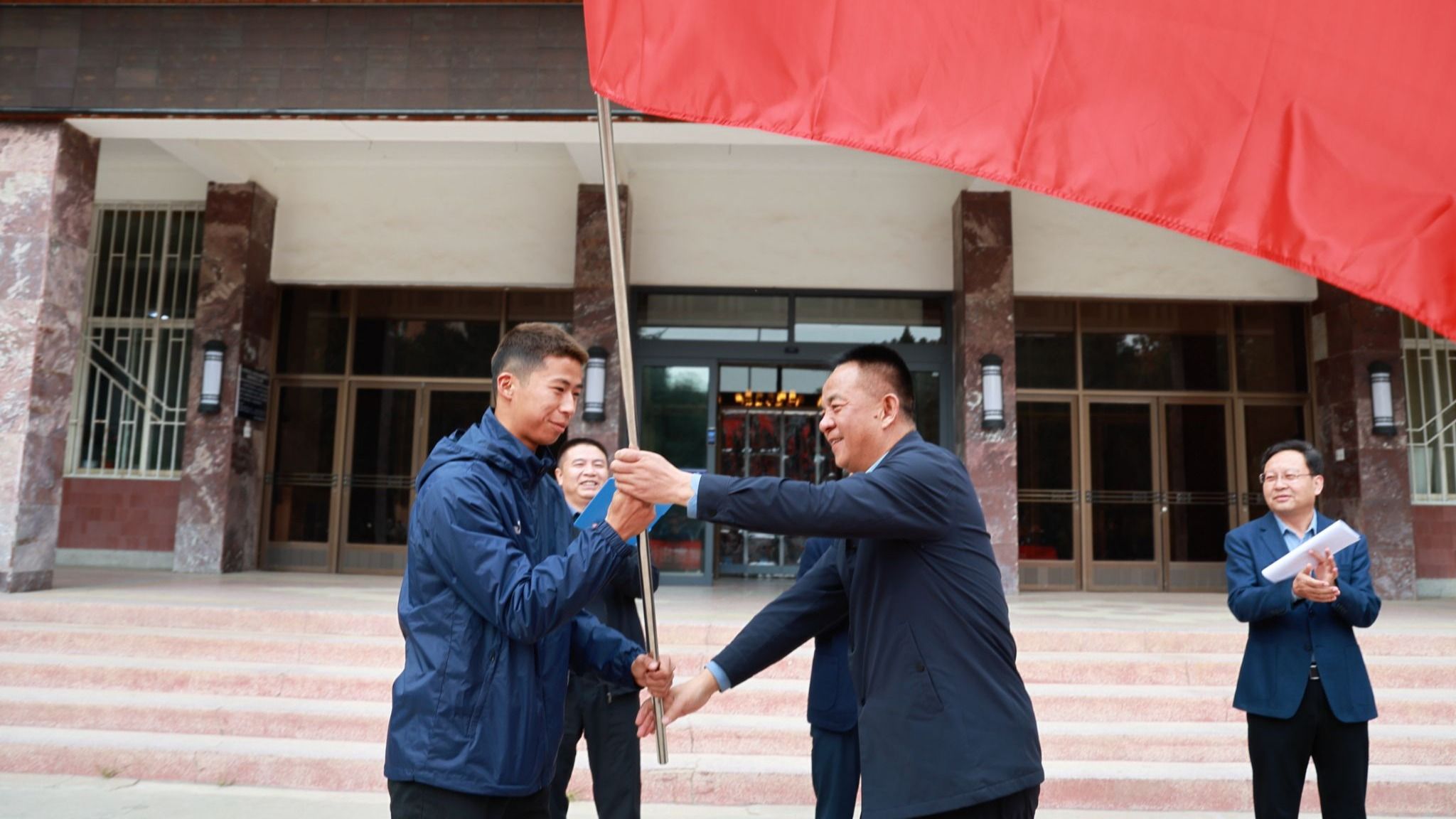 梁兆光向全体队员提出殷切希望。他强调,队员们要发扬敢于拼搏、永不放弃的体育精神,在赛场上全力争胜;要恪守体育道德,尊重规则、尊重对手、尊重裁判,展现河西学子良好的精神风貌;要紧密凝聚团队力量,坚信集体的力量是战胜一切困难的基石,真正做到赛出风格、赛出水平、赛出精神。他再三嘱咐队伍务必做好安全预案,确保旅途平安与比赛期间的人身安全,并预祝球队在全国赛场上高奏凯歌,载誉而归。随后,梁兆光将一面象征着荣誉、责任与使命的队旗郑重授予球队。