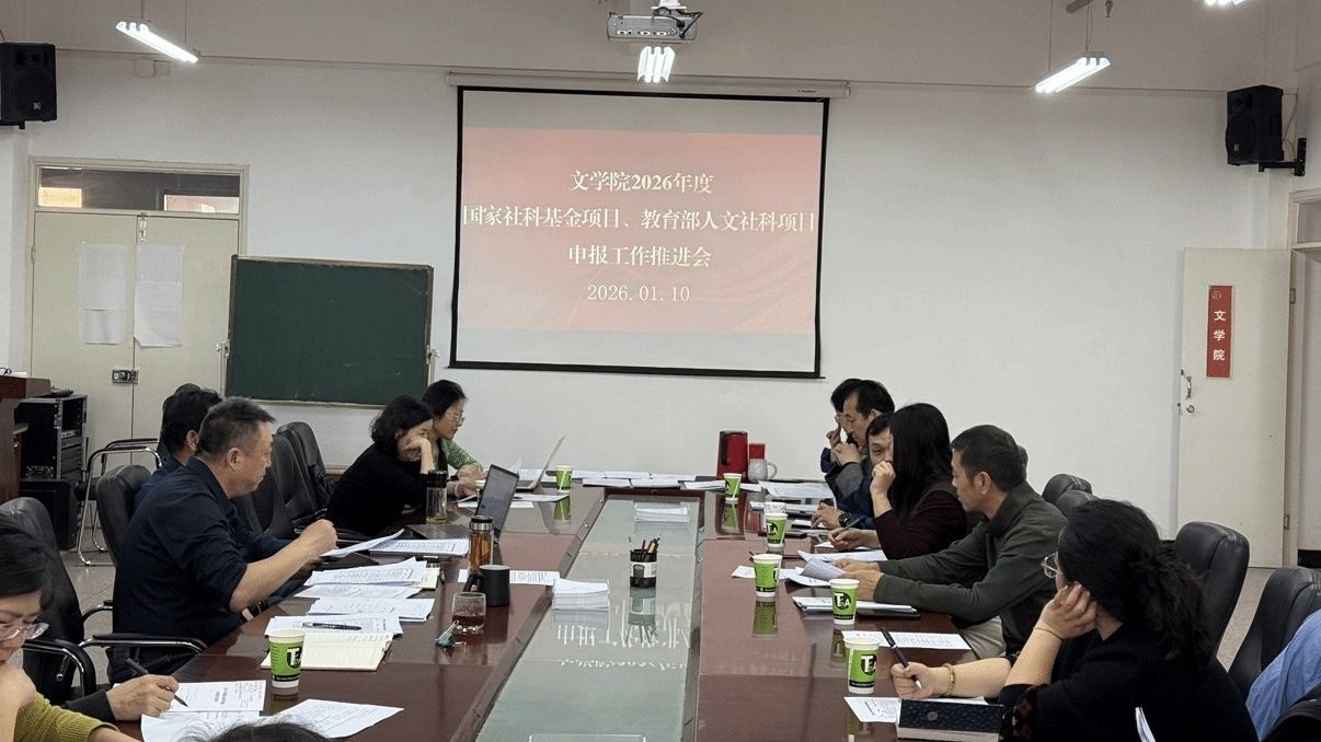 1月10日,文学院举办2026年度国家社科基金项目、教育部人文社科项目申报工作推进会。学院副教授及以上职称教师、博士学位教师、各教研室主任、学术委员会成员、14 位项目申报人及评议专家参会。