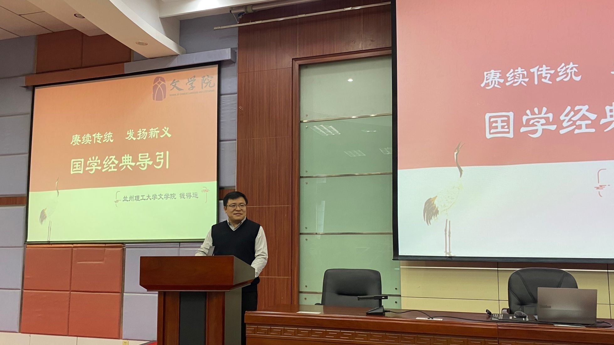 3月20日,文学院特邀兰州理工大学文学院院长、清华大学文学博士钱得运副教授举办题为“赓续传统 发扬新义——国学经典导引”的学术讲座。全院200余名学生参加。