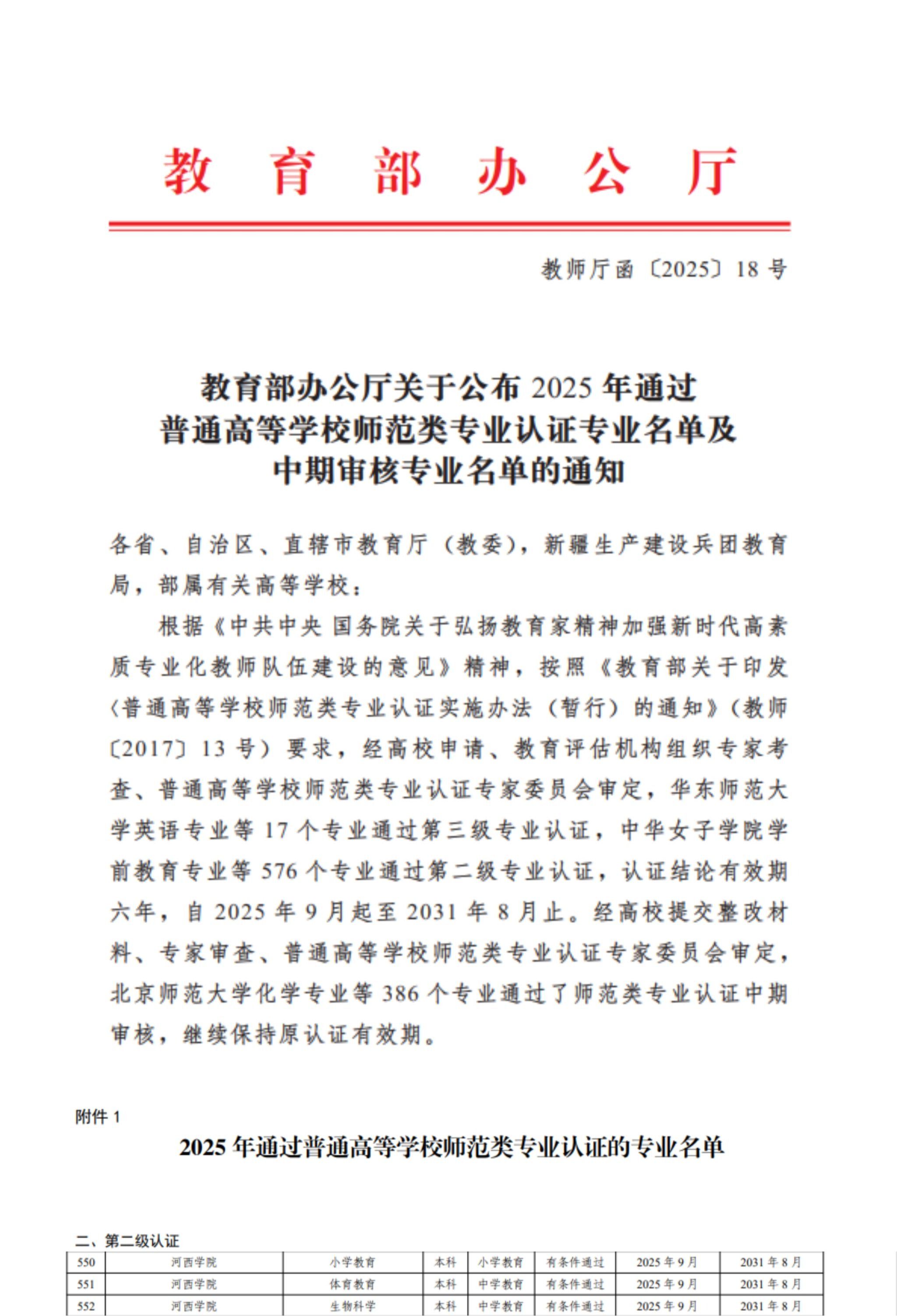 近日,教育部办公厅印发了《教育部办公厅关于公布2025年通过普通高等学校师范类专业认证及认证中期审核专业名单的通知》,公布了2025年通过普通高等学校师范类专业认证及中期审核的专业名单,我校小学教育、体育教育、生物科学3个专业顺利通过师范类专业中学教育第二级认证,认证结论有效期六年,自2025年9月起至2031年8月止。自2023年启动教育部师范类专业认证工作以来,学校在师范教育领域的建设成果持续凸显,截至目前,学校数学与应用数学、...