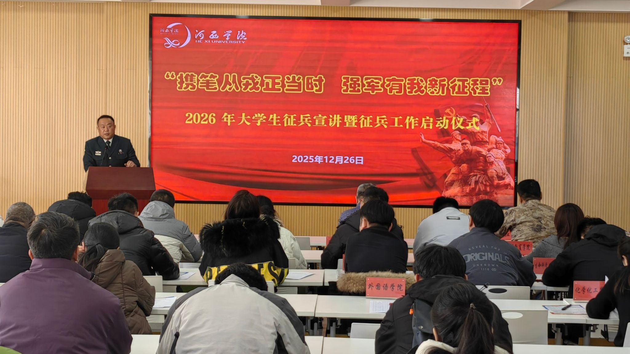 为深入贯彻落实国家征兵政策,扎实推进大学生征兵宣传工作,12月26日,学校举办2026年征兵工作启动仪式暨征兵政策宣讲会。张掖军分区、甘州区人民武装部,学校人民武装部工作人员、各二级学院负责征兵工作的辅导员、退役复学学生及军事爱好者协会成员共100余人参加活动。会上,学校人民武装部负责人对2026年征兵宣传及报名工作进行安排,明确了各阶段任务与要求;张掖军分区工作人员从国家战略、军队发展、个人成长等方面作了2026年征兵政策专题辅导与宣传指导,...